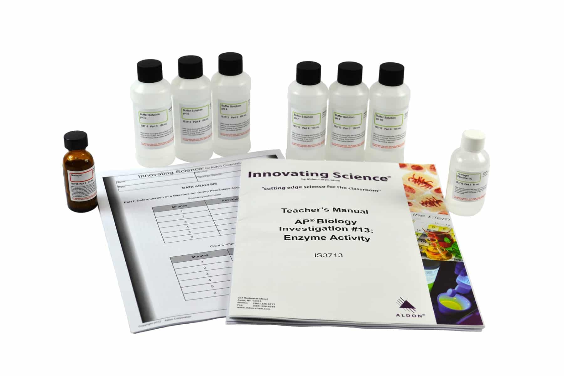 Students will learn the nature and specificity of enzyme-catalyzed reactions. Students will then use an extract of turnips to examine the reaction between hydrogen peroxide and the enzyme peroxidase while testing one or more factors that influence the rate of enzyme reactions.In this lab students will develop data collection strategies and analyze their results. This kit contains enough materials for 8 groups. Teachers manual and Student Study Guide copymasters are included. Meets AP Science Practices 4, 5, 6, and 7, and Big Idea 4.