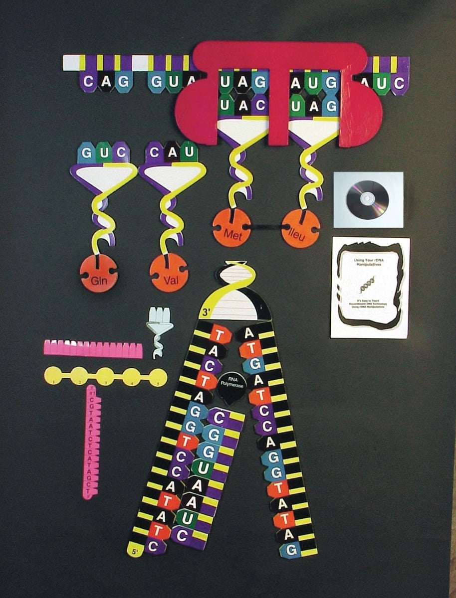 • 33 Teacher Manipulatives: These colorful, large DNA, mRNA, ribosome, tRNA and amino acid models attach to your blackboard and can be seen from the back of the classroom. You simulate the process for your students at your own pace, allowing students to ask questions as you proceed.