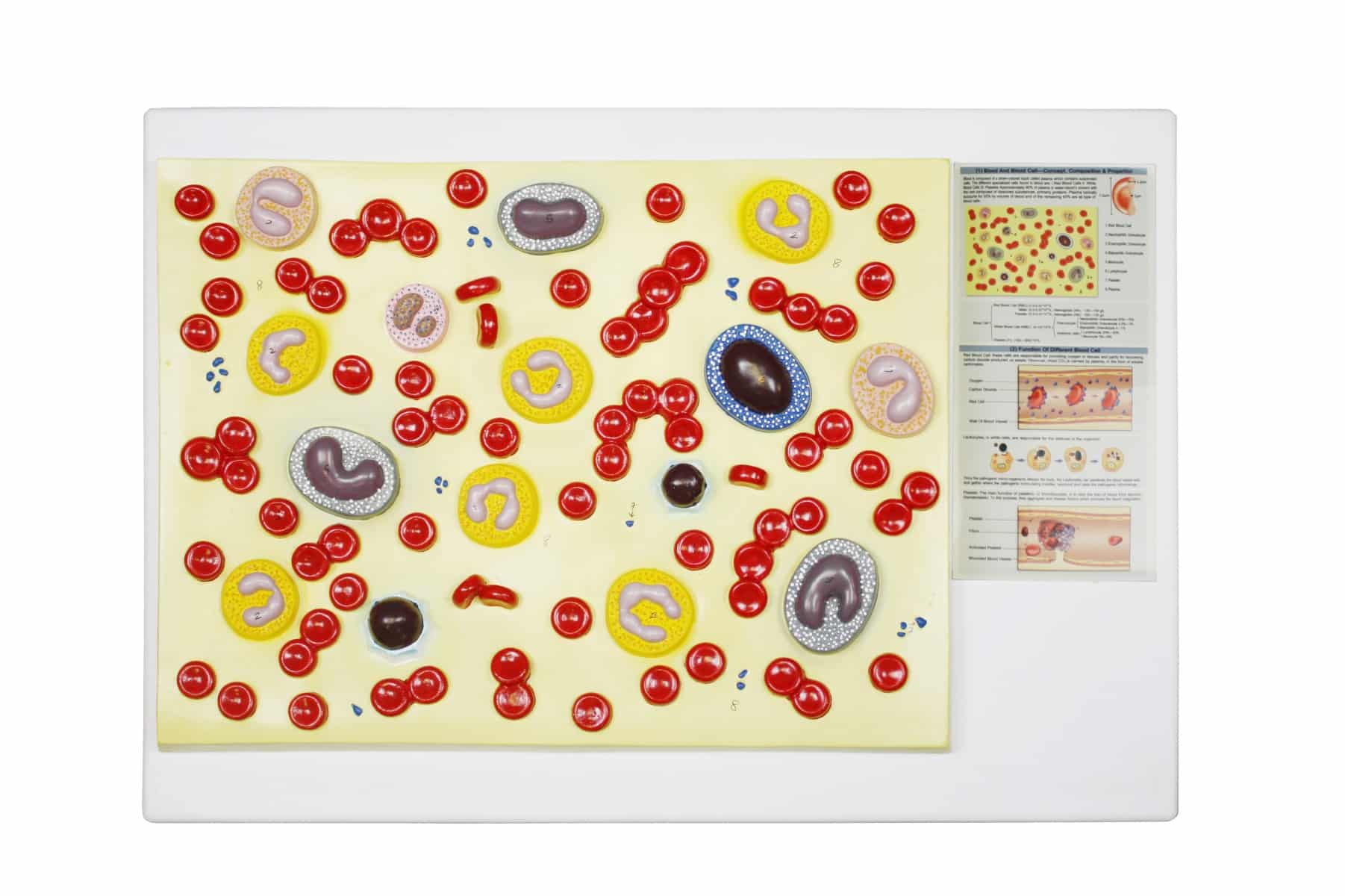 Blood cell model enlarged 2,000X and mounted on a 21” x 15” x 2.5” plastic board. This model shows the red blood cells, white blood cells (neutrophils, eosinophils, basophils, lymphocytes and monocytes) and blood platelets. All significant features are numbered and identifiable on the included key. Model is made exclusively from high quality medical PVC.