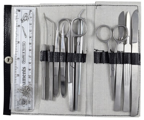 Finest quality dissection instruments in a double fold vinyl case. This dissecting kit contains two dissecting scissors – Iris and sharp/blunt. This dissecting kit also contains three fine quality scalpels to fulfill all possible cutting needs during dissection. Two fine quality forceps, one is medium point and other is fine point, are provided to handle dissection needs. Instruments are constructed of premium stainless steel unless otherwise noted.
