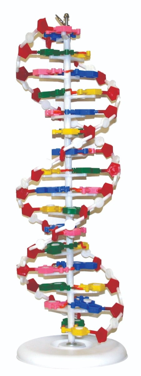 This double helix DNA model is pre-assembled and makes for a very impressive display and learning tool. Measures 25 x 8 inches, made of durable and colorful plastic and depicts a 16 base pair section built to a scale of 10cm to 1nm. The model is supported on a circular stand, which can fully rotate allowing you to view all of the components. The phosphate and deoxyribose are accurately portrayed and can be removed and separated for further examination along with the individual base pairs.