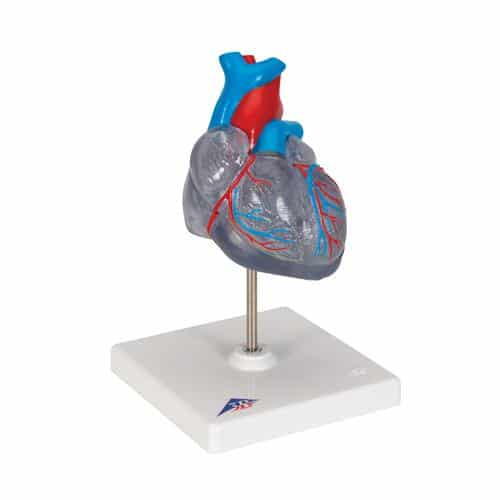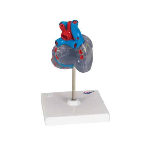 Highly detailed transparent 2-part heart with detachable front wall to reveal the chambers and valves inside. Heart is just slightly smaller than life-size with exquisite anatomical detail throughout. The complete conducting system of the human heart is represented in color. Heart delivered on removable stand.