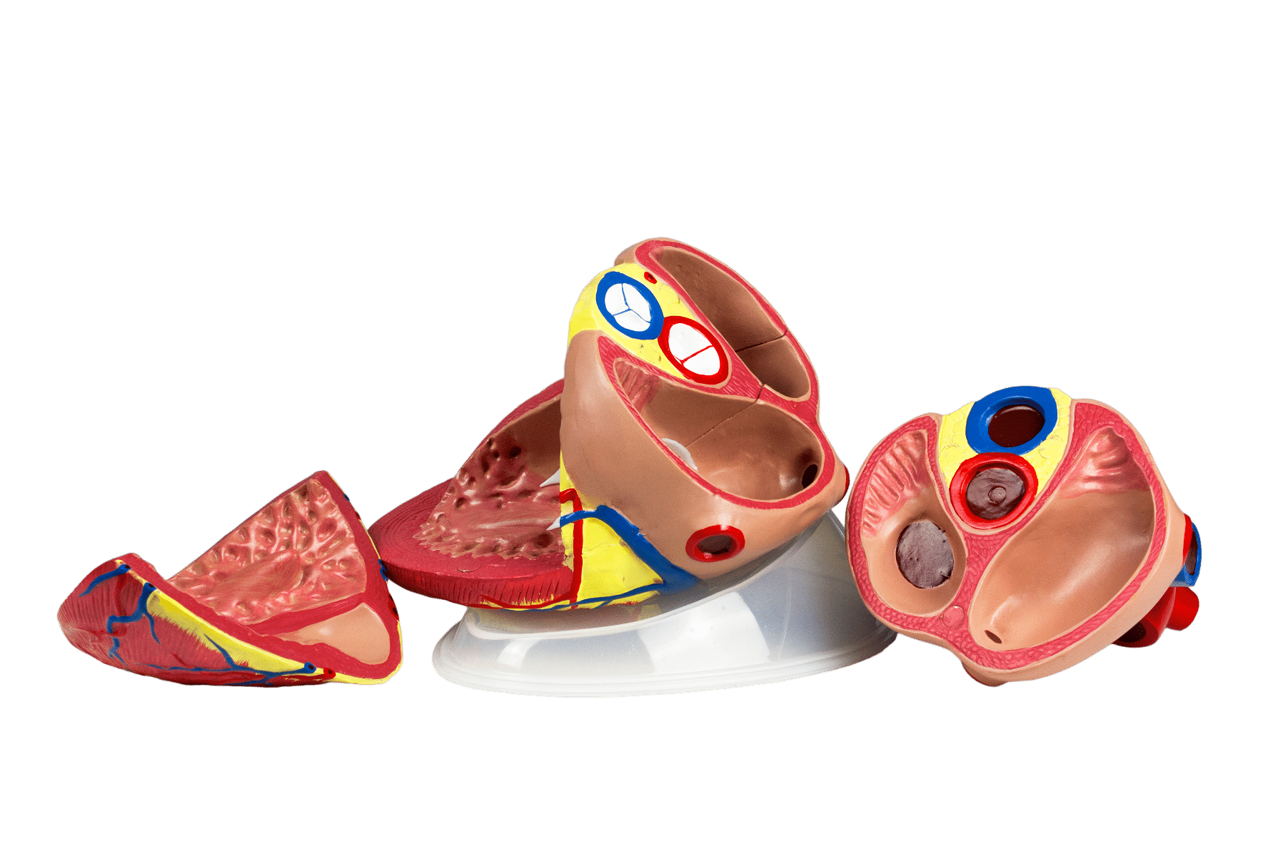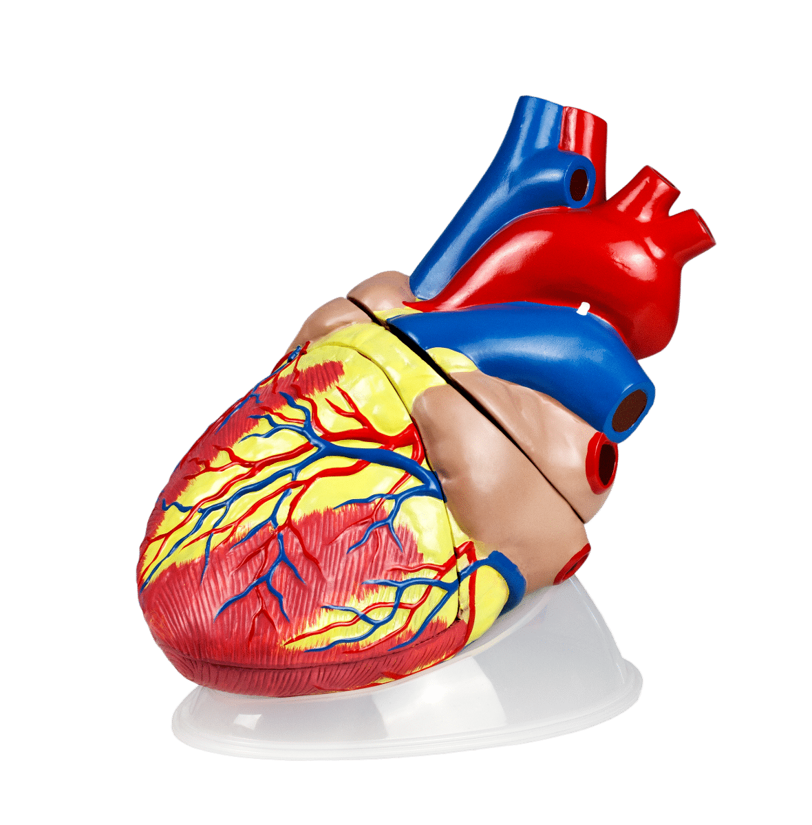 This 3-part model is 5X larger than the human heart. Sectioned along the anterior plane, this heart model shows the internal structures and cardiac valves that are important for learning the functions of the heart. The left and right ventricles can also be compared and examined in detail. Heart model made exclusively from PVC.