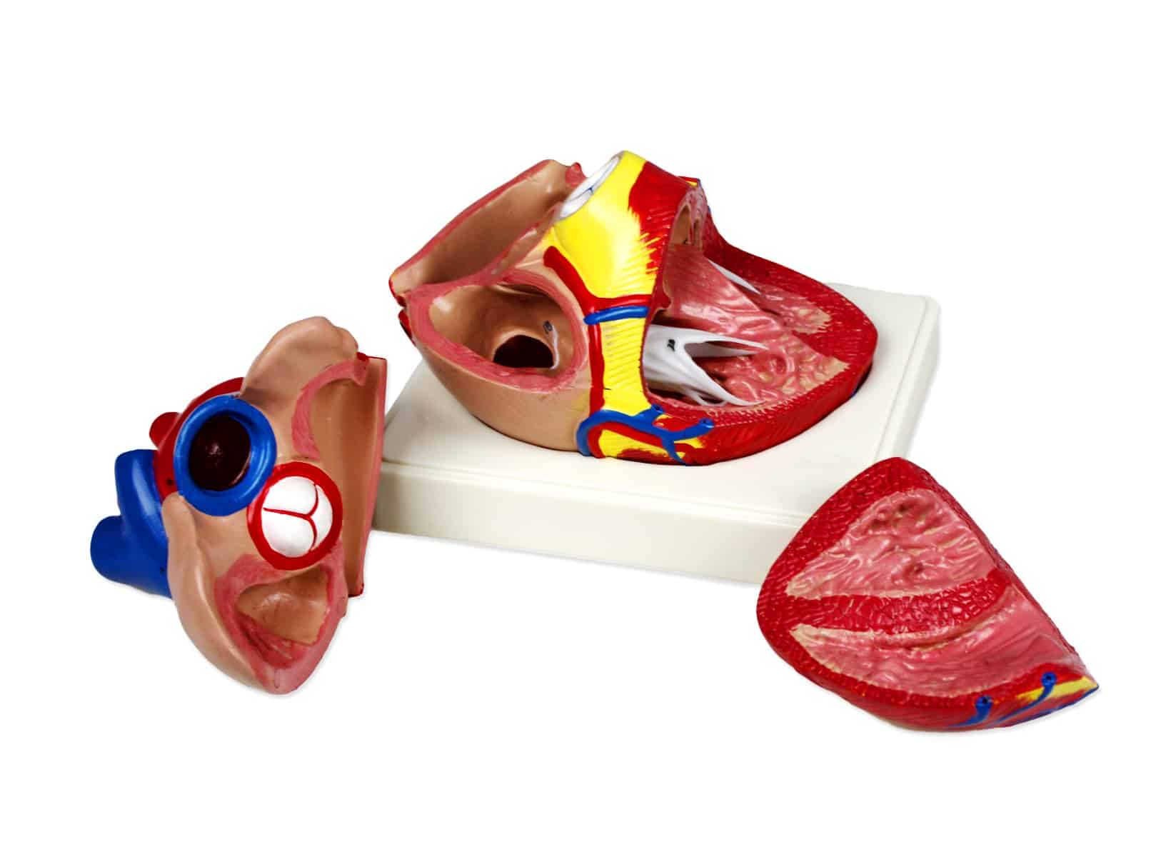 This 3-part model is 3X larger than the human heart. Sectioned along the anterior plane, this heart model shows the internal structures and cardiac valves that are important for learning the functions of the heart. The left and right ventricles can also be compared and examined in detail. Heart model made exclusively from PVC.