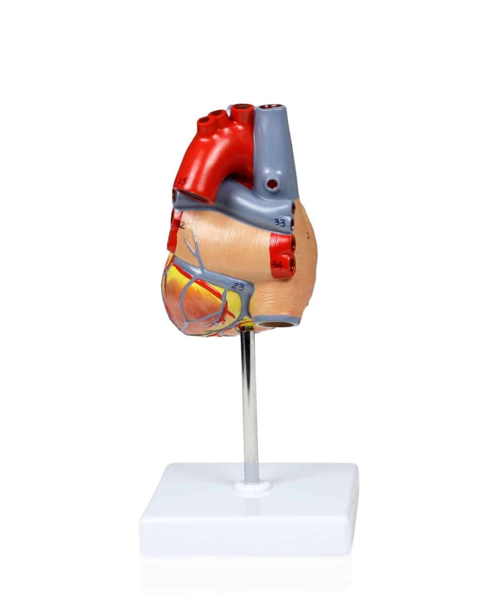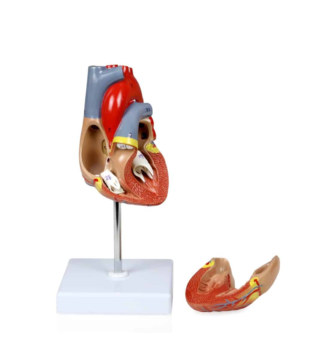 This life-sized heart can be removed from its base and split into 2 parts. Model allows viewing of the heart chambers, valves and major blood vessels. Labeled diagram included. Model is made from high quality medical PVC.