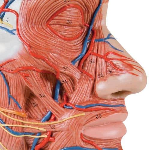 This high quality model represents the outer, superficial and the internal (median section) structures of head and neck. The half head with musculature is delivered on removable stand for easy display in a classroom or doctor’s office. Important anatomical structures are present.