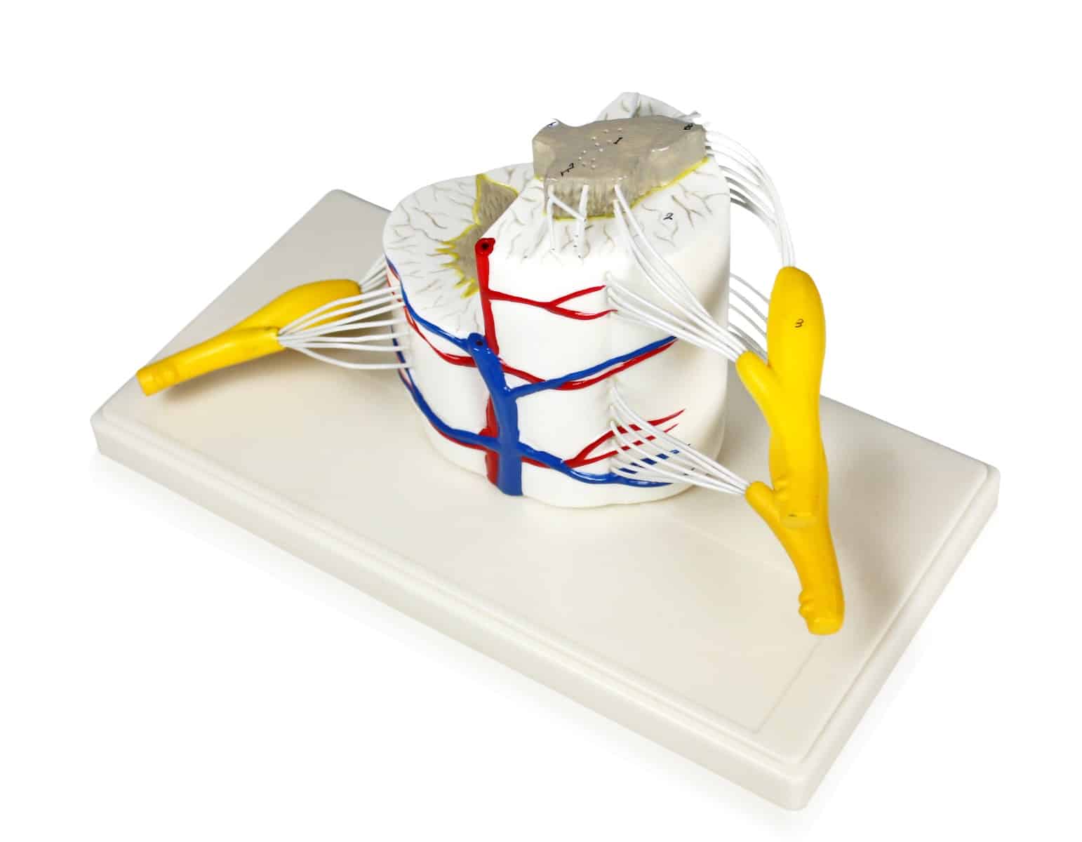 This spinal cord model is 5X life-size and is sectioned both longitudinally and in cross-section to show the anterior and posterior nerve roots, ganglia and blood vessels. Mounted on a base.