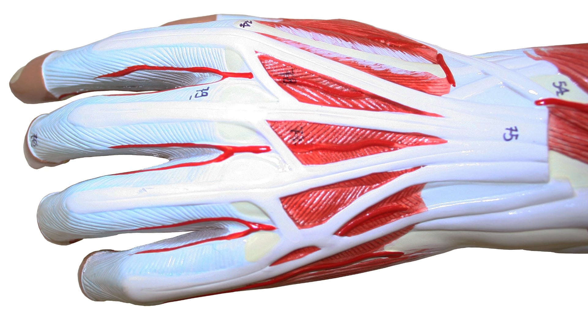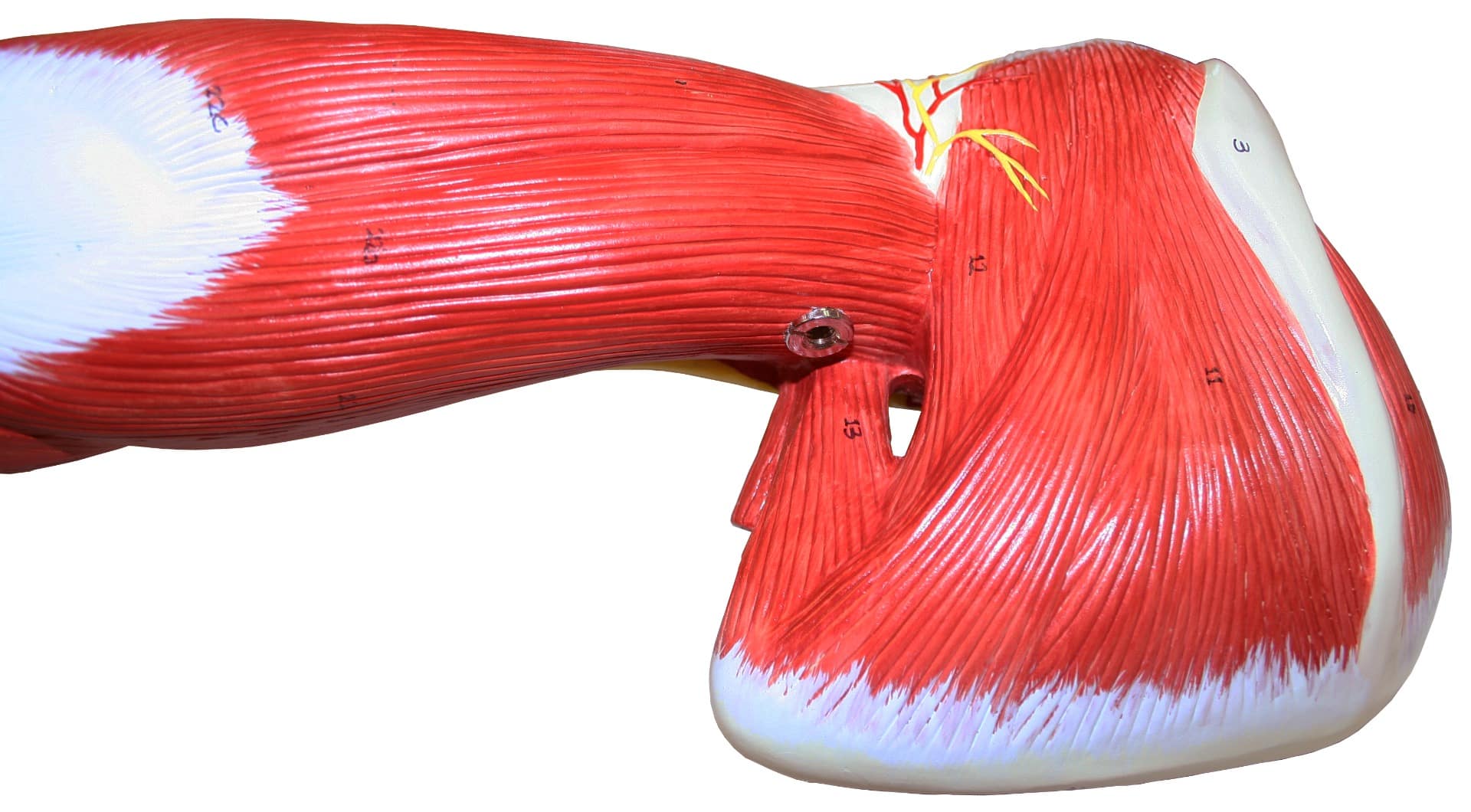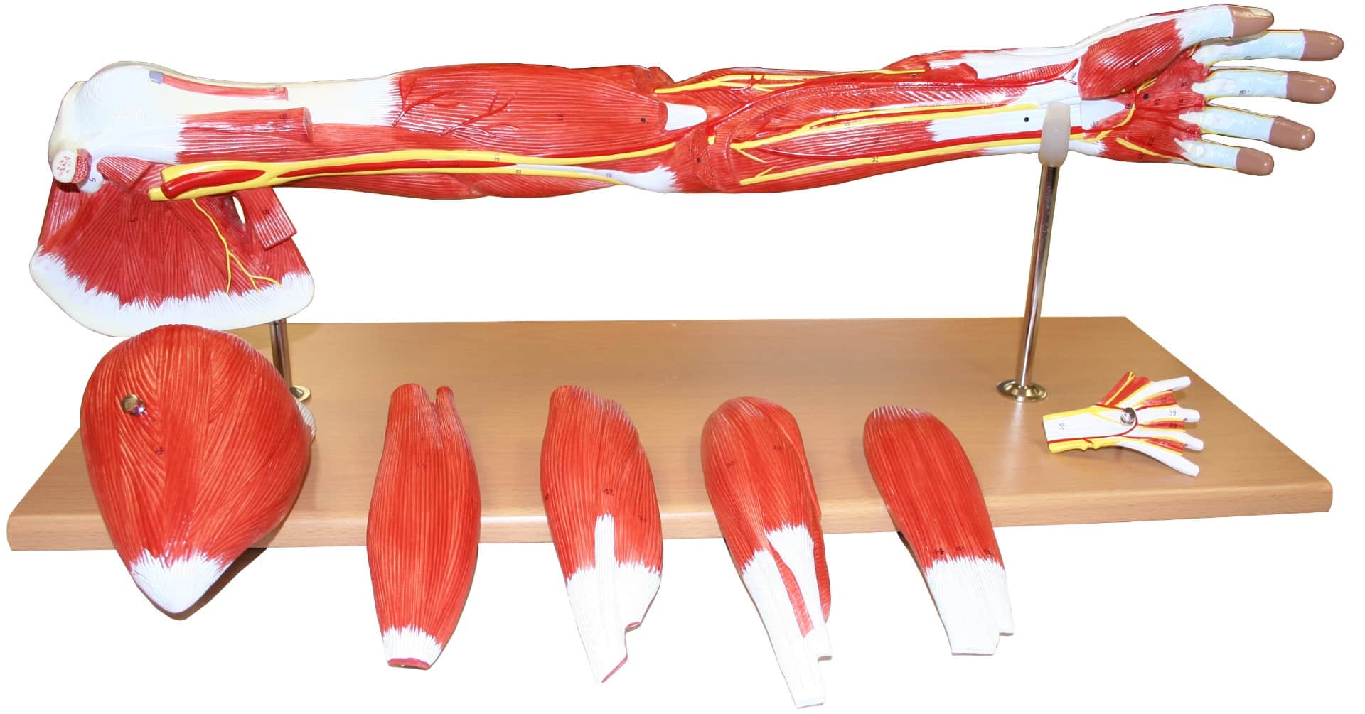 Discover the muscles of the human arm with this life-size 7-part arm model. Easily examine the deep arm muscles by removing the superficial muscles, and locate the palmar aponeurosis in the hand. The hand and shoulder are also well presented for detailed study of the muscles comprising the rotator cuff and hand. Vasculature, nerves, and ligaments can also be examined. Accompanied by key card. Model is made exclusively from high quality medical PVC.
