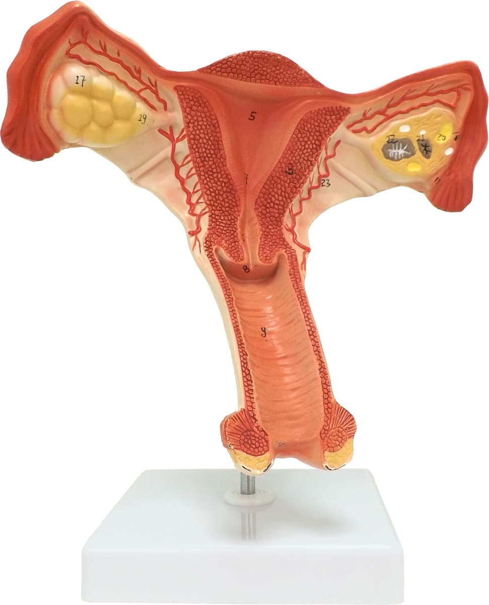 Our model of the female internal reproductive organ is coronally sectioned to reveal the important internal structures of the vagina, cervix and cervical canal, and fallopian tubes with ovaries. One ovary is opened to display representations of corpus luteum & albicans, and a mature follicle. Model is made exclusively from high quality medical PVC.