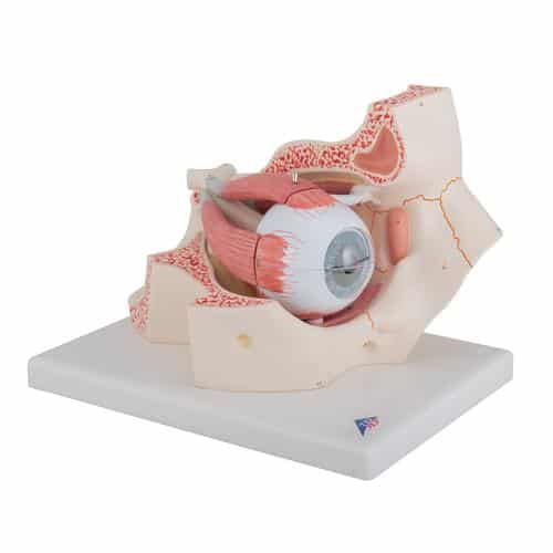 This large anatomical human eye model shows the optic nerve in its natural position in the bony orbit of the eye (floor and medial wall). At three times life-size this eye model is great for anatomical demonstrations. Mounted on a square base.