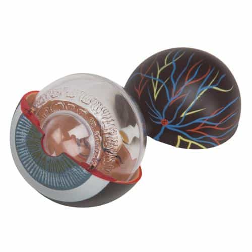 This classic human eye model is 3 times life-size and comes mounted on a circular base. It is a great model to teach and learn the anatomy of the human eye! Dissects into the following parts: