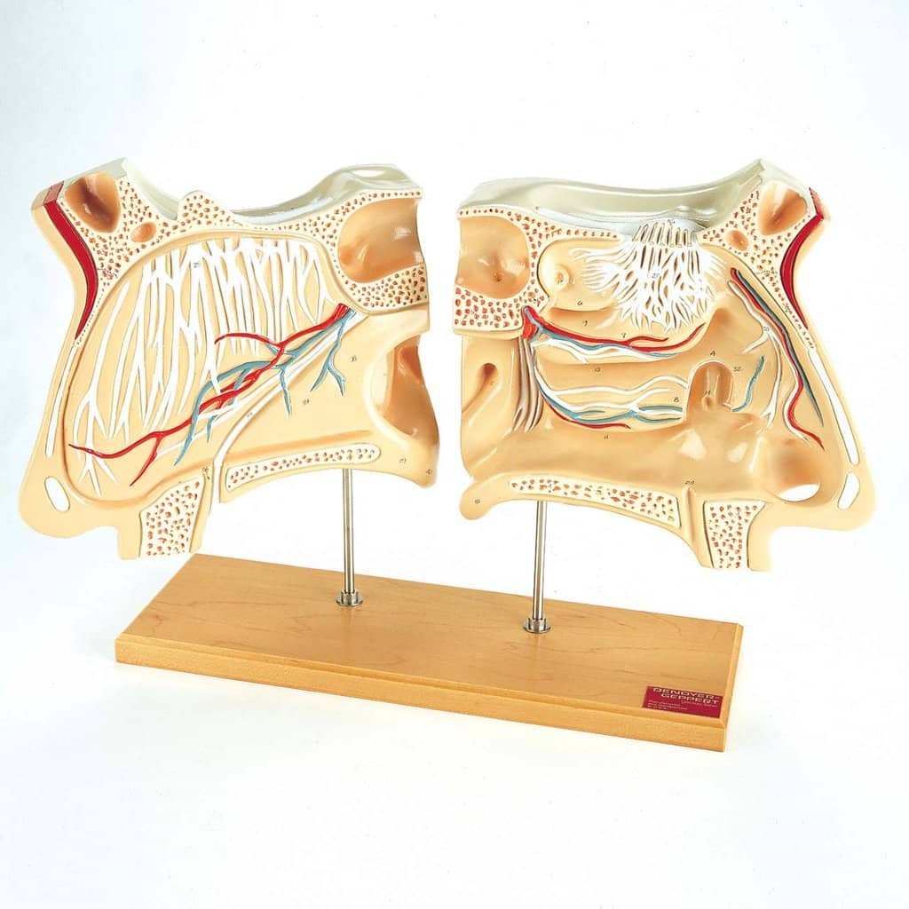 Two unbreakable plastic models on one hardwood base depict the nose and nasal passages enlarged to four times their normal size. A wonderful supplement to dissection because it depicts structures inaccessible in most dissections.