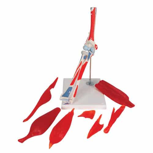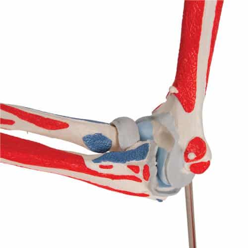 Represented here is the right elbow of a male with individual muscles plus muscle origins and insertions on the humerus, radius, and ulna. For didactic reasons, the areas of the muscular origins (red) and insertions (blue) are raised and color-coded. The elbow muscles have been mounted on their corresponding regions of origin and insertion and are removable for a different perspective. Model is mounted on a stand.