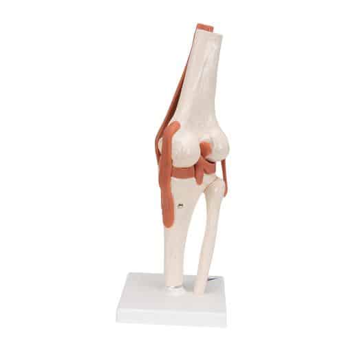 This high quality life-size functional knee joint model clearly shows the anatomy and mechanics of the knee joint. Model consists of the femur with portions of the tibia and fibula, as well as the meniscus, patella with quadriceps tendon, and joint ligaments. This fully flexible knee joint demonstrates abduction, anteversion, retroversion and internal/external rotation. Comes mounted on a removable stand.