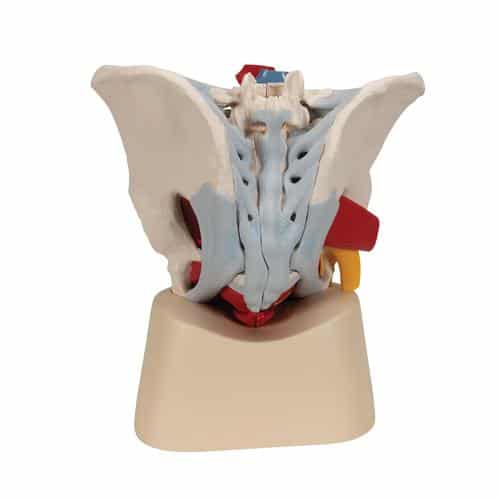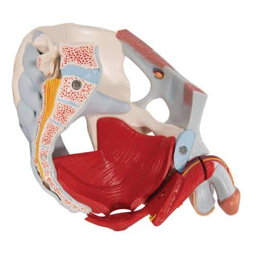 This 7 part model of the male pelvis shows in accurate detail how the bones, ligaments, vessels and nerves as well as the pelvic floor muscles and the external sex organs are connected to each other. It shows the whole pelvis, through which a median section has been placed. The right side of the external anal sphincter, the M. ischiocavernosus, the M. transversus perinei profundus and superficialis and the M. bulbospongiosus can be removed together.