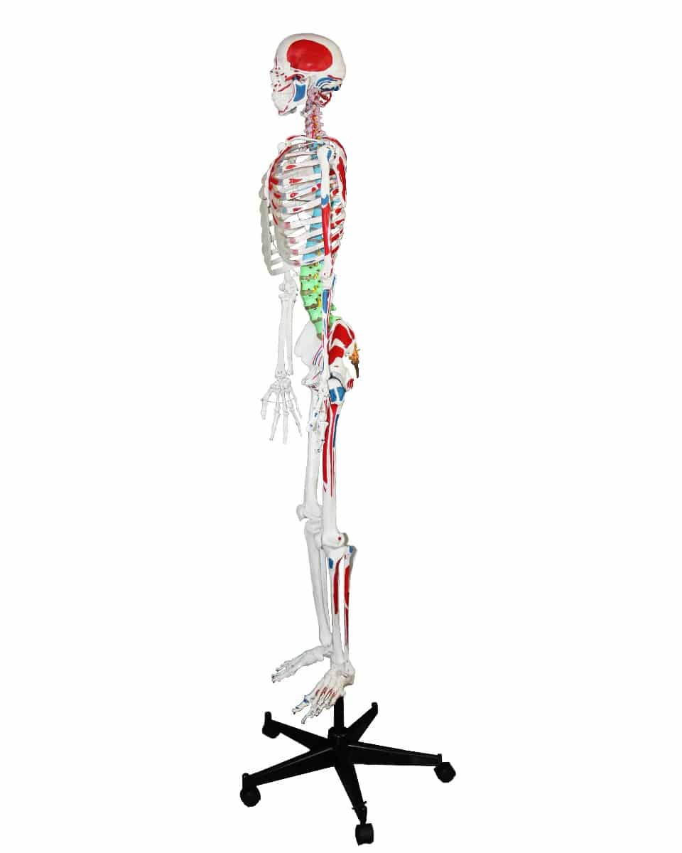 This full-size human skeleton is a wonderful addition to any classroom or medical office. Skeleton is cast with naturally coloured plastic, and the left side is painted and labeled to realistically display the muscle origins in red and muscle insertions in blue. Spinal column is colour-coded and labeled. All vertebral arteries, spinal nerves and intervertebral discs are shown, including a prolapsed L3-L4 intervertebral disc. The three-part skull features a removable skullcap and mandible, suture lines and a full dentition. Skeleton has been wired for natural movement and the arms and legs are detachable for closer examination. Comes pelvic mounted on a roller base and includes an easy-to-read corresponding colored diagram.