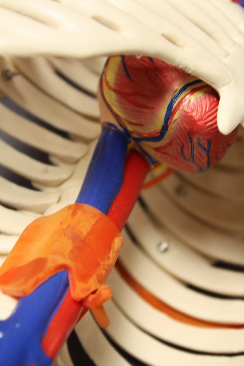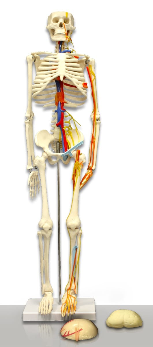 This half-size human skeleton is 85cm tall and is mounted on a stand. All bones are individually cast (except for the hands and feet) and wired together to show the natural movement of the skeleton. The left side of the skeleton has representations of the nerves, veins, arteries and ligaments of the human body. The skull cap is detachable and inside is an opaque white molded brain that can be removed. The attached heart inside the chest cavity is a nice additional feature to understanding the vascular system. Labeled diagram included.