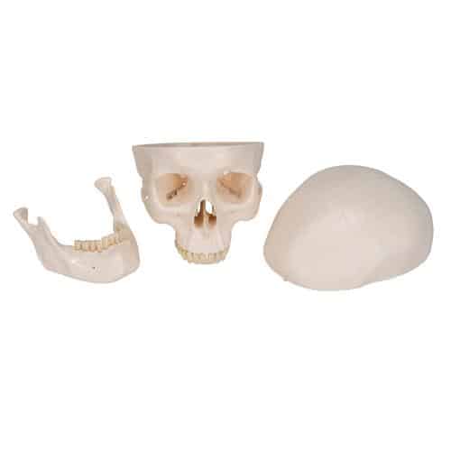 This 3 part, high quality classic human skull is handmade from hard, unbreakable plastic and accurately demonstrates the details of a natural skull. Skull can be disassembled into skull cap, base of skull and mandible and the mandible is mounted on a spring to easily demonstrate natural movement. Highly accurate representation of the fissures, foramina, processes and sutures. Each tooth is individually cast for a realistic looking dentition. A perfect choice for any medical professional or student.