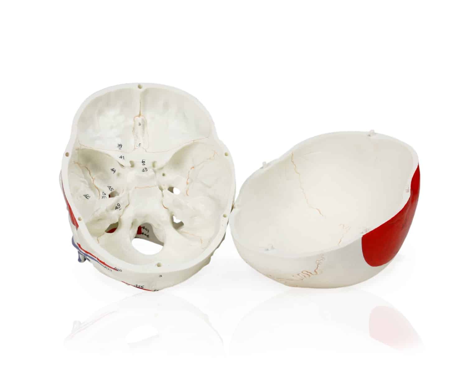 This 3 part model has numerical markings for easy identification of the cranial bones, sutures and muscles. It features hand-painted sutures in orange, muscle origins in red and insertions in blue. The skull cap is magnetic and can be removed for further study of the inner cranial bones. Jaw is spring mounted to show natural movement of the mandible and is detachable for closer investigation. Model includes corresponding key card and is made exclusively from medical quality PVC.