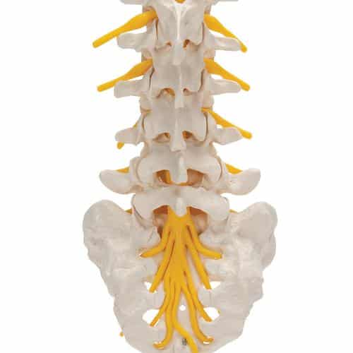 The human lumbar spinal column consists of the 5 lumbar vertebrae with intervertebral discs, sacrum with flap, coccyx, spinal nerves and dura mater of spinal cord. This high quality model has accurate anatomical detail for use in any anatomy classroom. The lumbar spinal column is delivered on a removable stand.