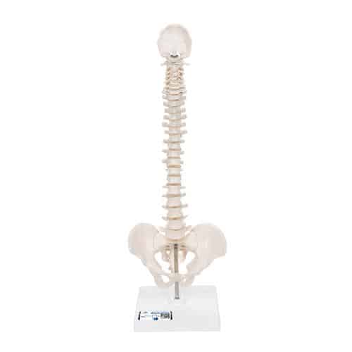 This mini spinal column consists of the occipital plate, sacrum, coccyx, intevertebral discs, and pelvis. Vertebral column is flexibly mounted to demonstrate natural movements and pathological changes. Delivered on a detachable stand.