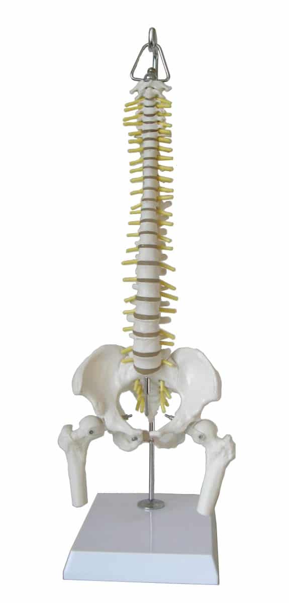 This (50cm) spinal column model with occipital bone consists of 24 vertebrae with soft vinyl discs, sacrum, coccyx, and pelvic bones with femur heads. Nerve endings are exposed. Model comes with hanging stand and accompanying key card. Spinal column is made exclusively from high quality medical PVC.