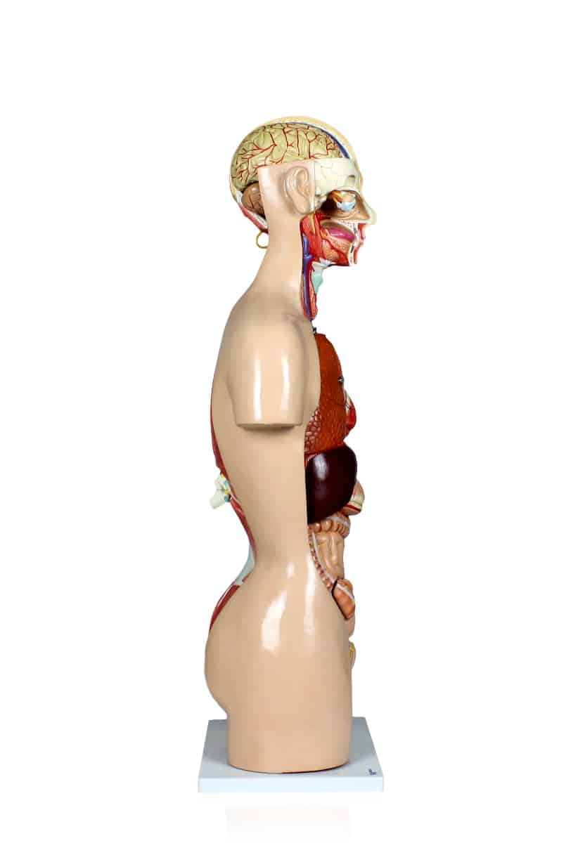This life-size human torso has 27 removable parts featuring exchangeable male and female reproductive organs. The head is opened exposing one half of the brain and the neck is dissected to show muscular, glandular, vascular, and neural structures. The cerebellum and lungs can be completely removed showing the important structures of the head and inner wall of the thoracic cavity. The thorax and abdomen are removable allowing easy observation of the internal organs while the back is opened and dissected showing the vertebral column, spinal cord, and nerve endings. Further examination of the spinal cord is also possible with the removal of the 12th thoracic vertebrae. Torso is made exclusively from high quality medical PVC.