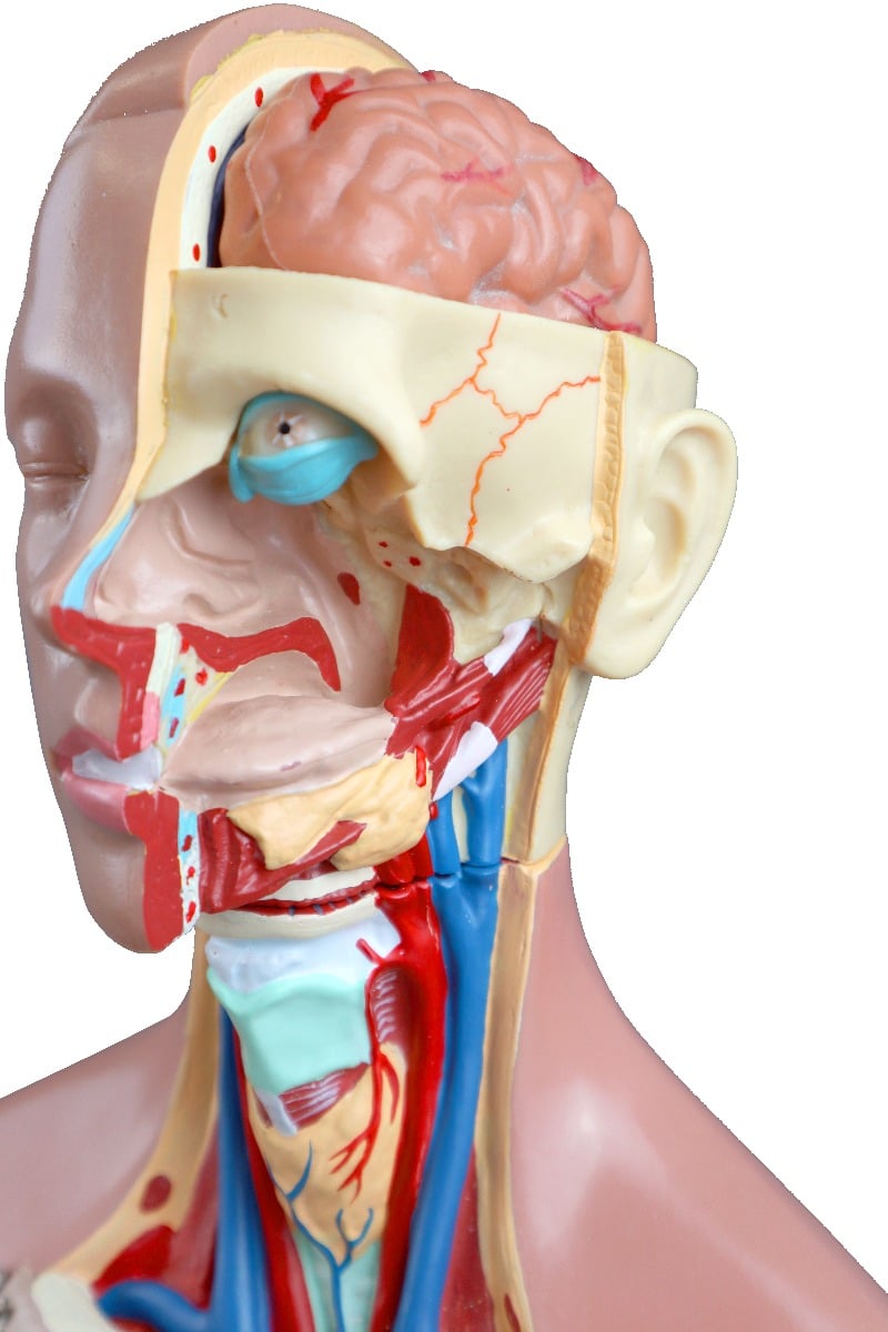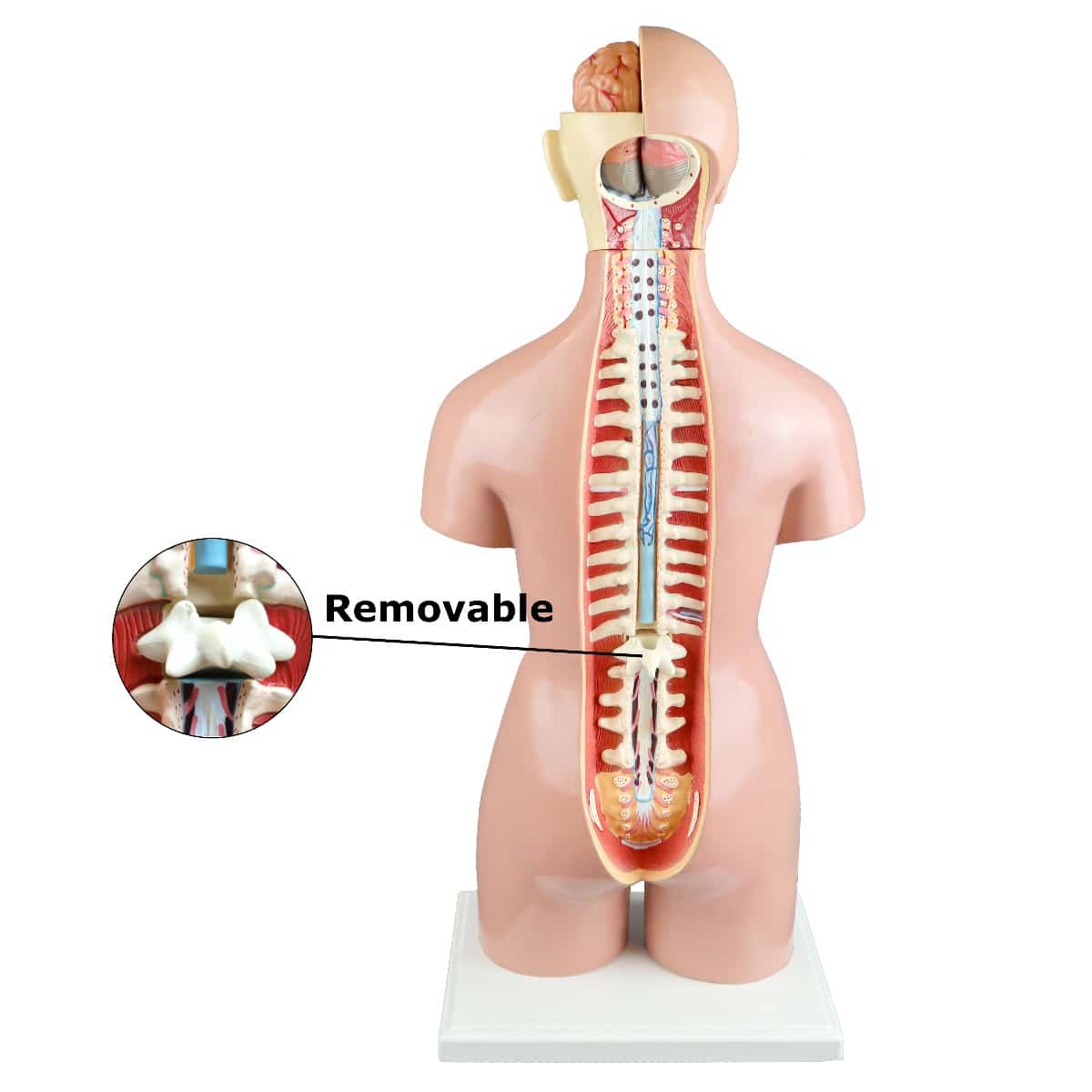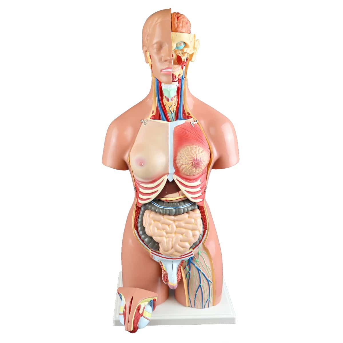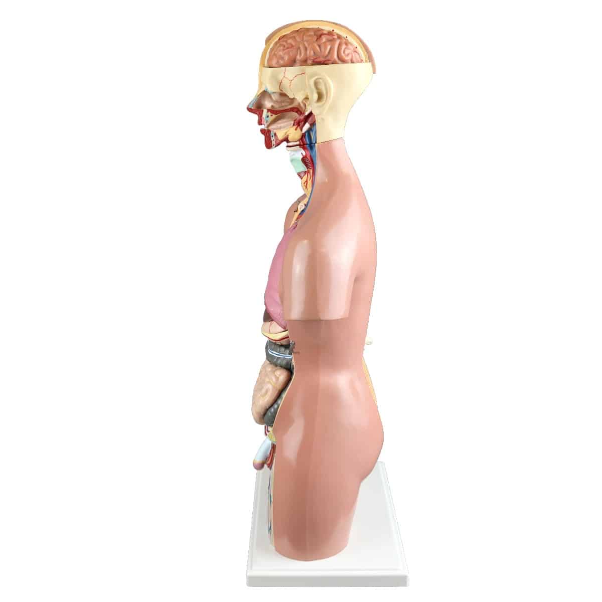 This 22 part, 55cm human torso features exchangeable male and female reproductive organs. The head is opened, exposing one half of the brain and the neck is dissected to show muscular, glandular, vascular, and neural structure. The cerebellum and lungs can be completely removed, showing the important structure of the head and inner wall of thoracic cavity. The thorax and abdomen are removable allowing easy observation of the internal organs while the back is opened and dissected showing the vertebral column, spinal cord, and nerve endings. Further examination of the spinal cord is also possible with the removal of the 1st lumbar vertebrae. Torso is made exclusively from high quality medical PVC.