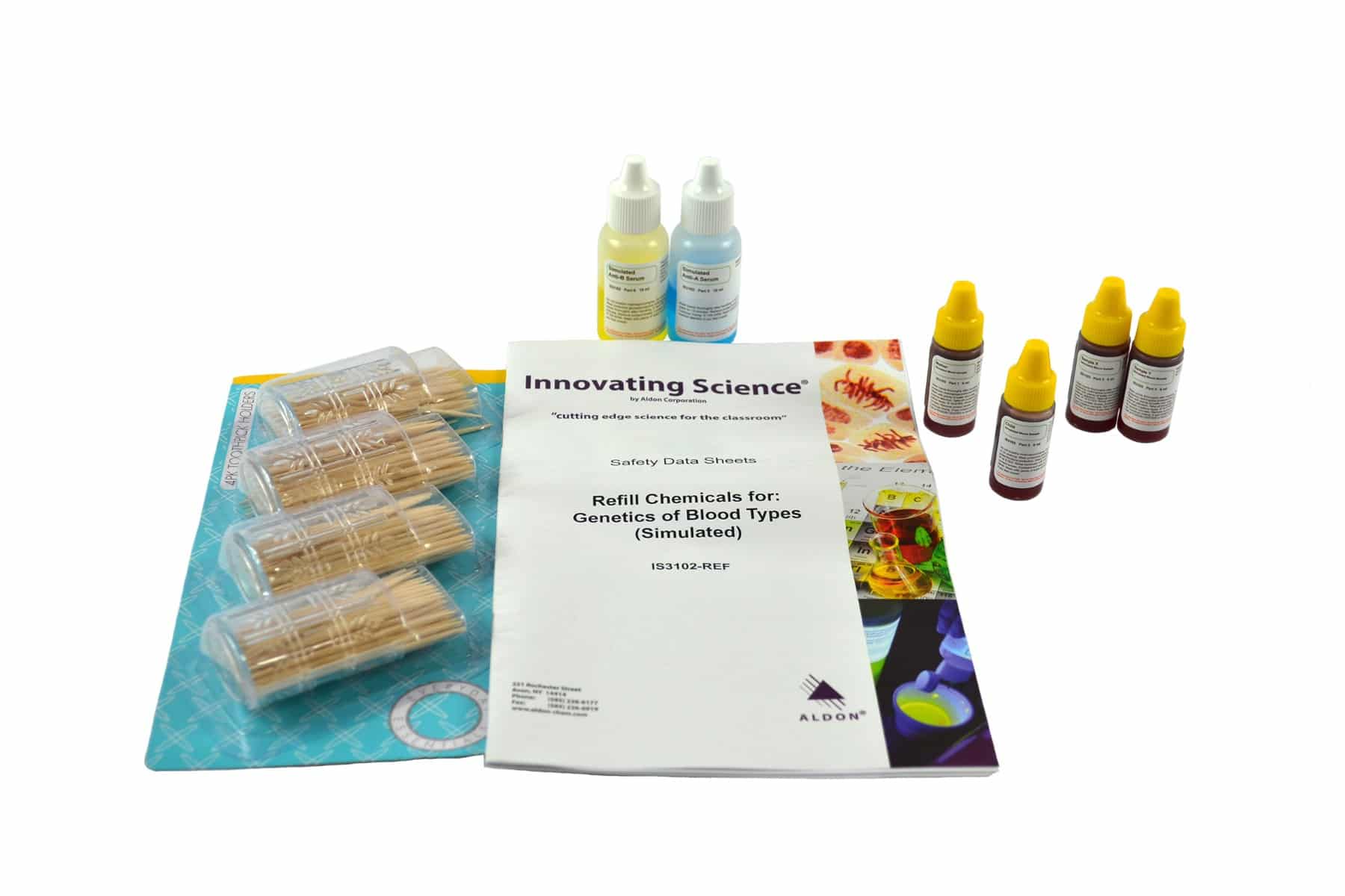 • Simulated blood samples for realistic replication of blood typing procedure, and safe classroom use