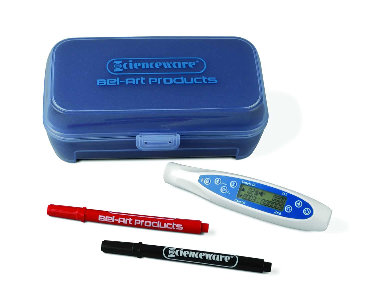 A cost effective and accurate way to count colonies of bacteria or other microorganisms grown on an agar plate. This simple to operate device marks, counts, and gives an audible and visual alert each time a count is registered. The lightweight, pen-style design reduces the likelihood of error, combining all aspects of counting into one motion.