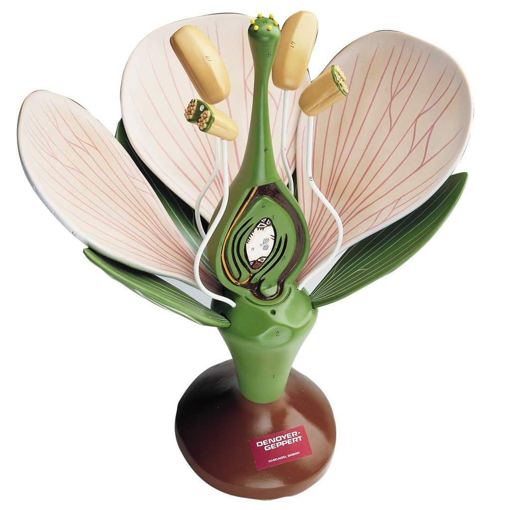 Representing a greatly enlarged idealized complete flower, this non-breakable vinyl plastic model teaches the reproduction function of flowers, angiosperm pollination and fertilization. It incorporates all four floral series: the sterile calyx (sepals) and corolla (petals); the fertile androecium (stamens) and gynoecium (pistil). Dissections expose the intricacies of angiosperm reproduction. Pollination is demonstrated by six pollen grains which have adhered to the stigma. One of them has generated a pollen tube which has penetrated the micropyle. Depicting the condition just prior to double fertilization, the tube nucleus, closely followed by the two sperm cells, can be observed near the apex of the pollen tube. One sperm is destined to fertilize the two polar nuclei forming the nutritive triploid endosperm. The other will fertilize the egg to form the diploid zygote. 27 hand-coded structures are identified in the accompanying key.