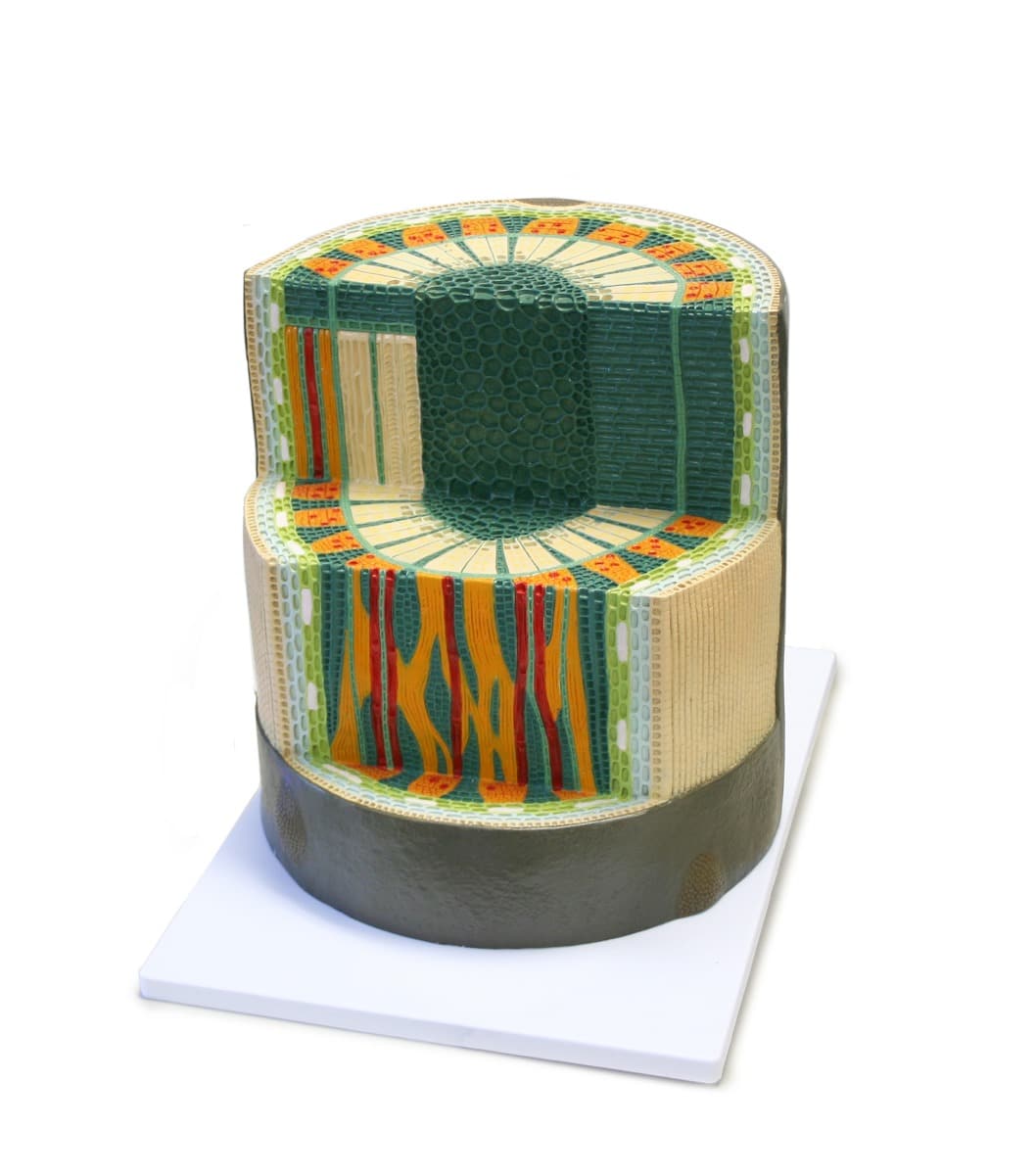 This model highlights the details of a dicotyledonous stem in vivid colors showing the longitudinal and cross section of the periderm, cortex, primary phloem, phloem ray, cambium, annual ring, wood ray, primary xylem, and marrow. Enlarged 120X and mounted on a base.