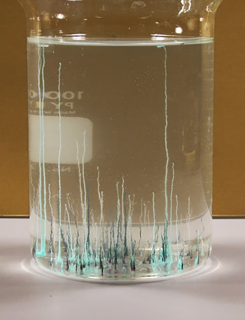 A few colored crystals are added to a clear solution in a glass jar or beaker. Within a few minutes large plant like structures extend from the crystals.