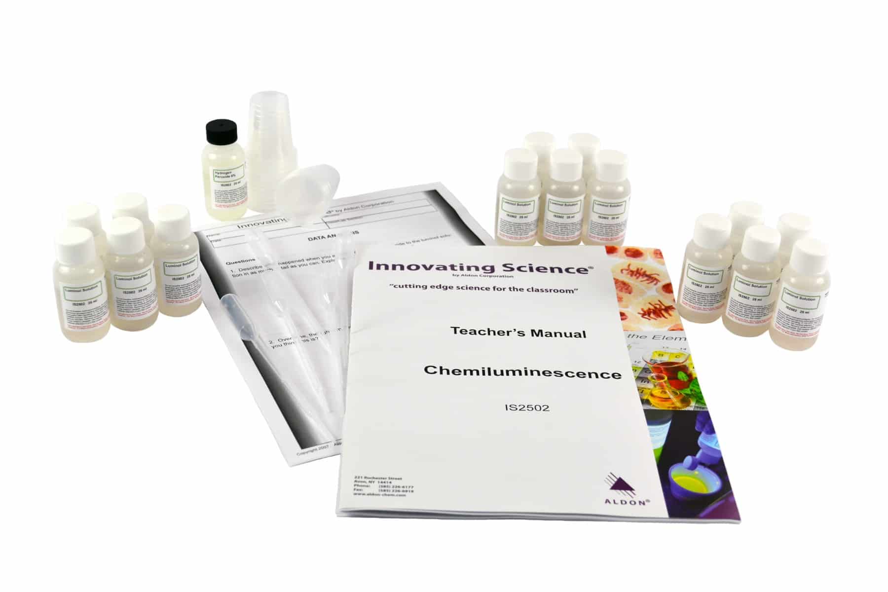 Most physical and chemical reactions that involve the release of light energy also involve the release of heat energy. One unique and interesting form of light-emitting reaction is called chemiluminescence, or “cool light.” Similar to the familiar glow of a firefly, students will create a chemiluminescent reaction in the classroom, and then observe the fascinating blue glow of the reaction, which lasts for over ten minutes. This is chemistry that never fails to amaze students. The kit contains enough materials for 15 groups.