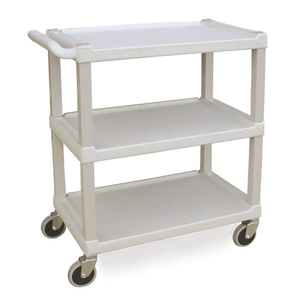This standard duty plastic utility cart is made of stain and odor resistant material that maintains sanitation. The sturdy construction is impact-resistant and the 4″ all swivel casters provide ultimate maneuverability. This cart is easily assembled without hardware. Attractive beige color blends with any decor.