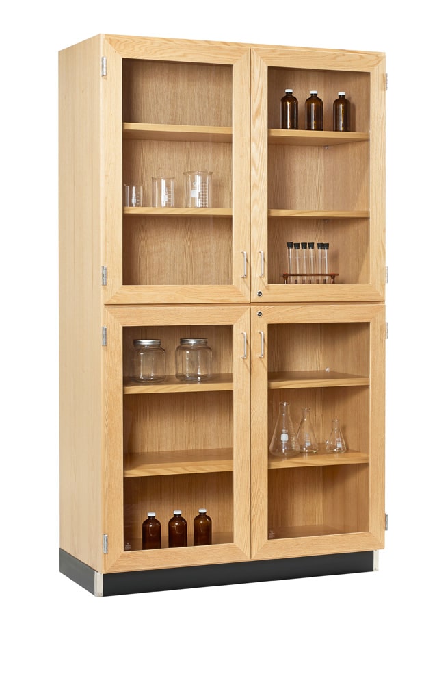 Four glass door oak display cabinets are a great addition to the classroom. The top and bottom doors are divided making it easy to segregate your display types. The fixed shelf in the middle creates the ability to lock the top and the bottom doors separately. The right hinged doors have a lock which locks both right and left hinged (with astragal) doors. There is also a fixed bottom shelf and two adjustable shelves in the bottom and top sections each. Each shelf holds 40 lbs. per square foot. 36″W and 48″W units have 1″ thick shelves.