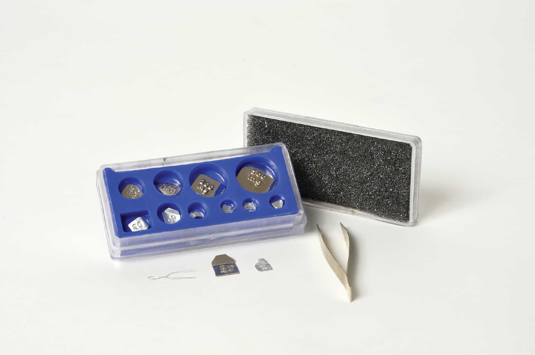 Set includes 1 each of 1mg, 5mg, 10mg, 50mg, 100mg, and 500mg weights, two each of 2mg, 20mg, and 200mg weights, rider, forceps and rectangular plastic box.