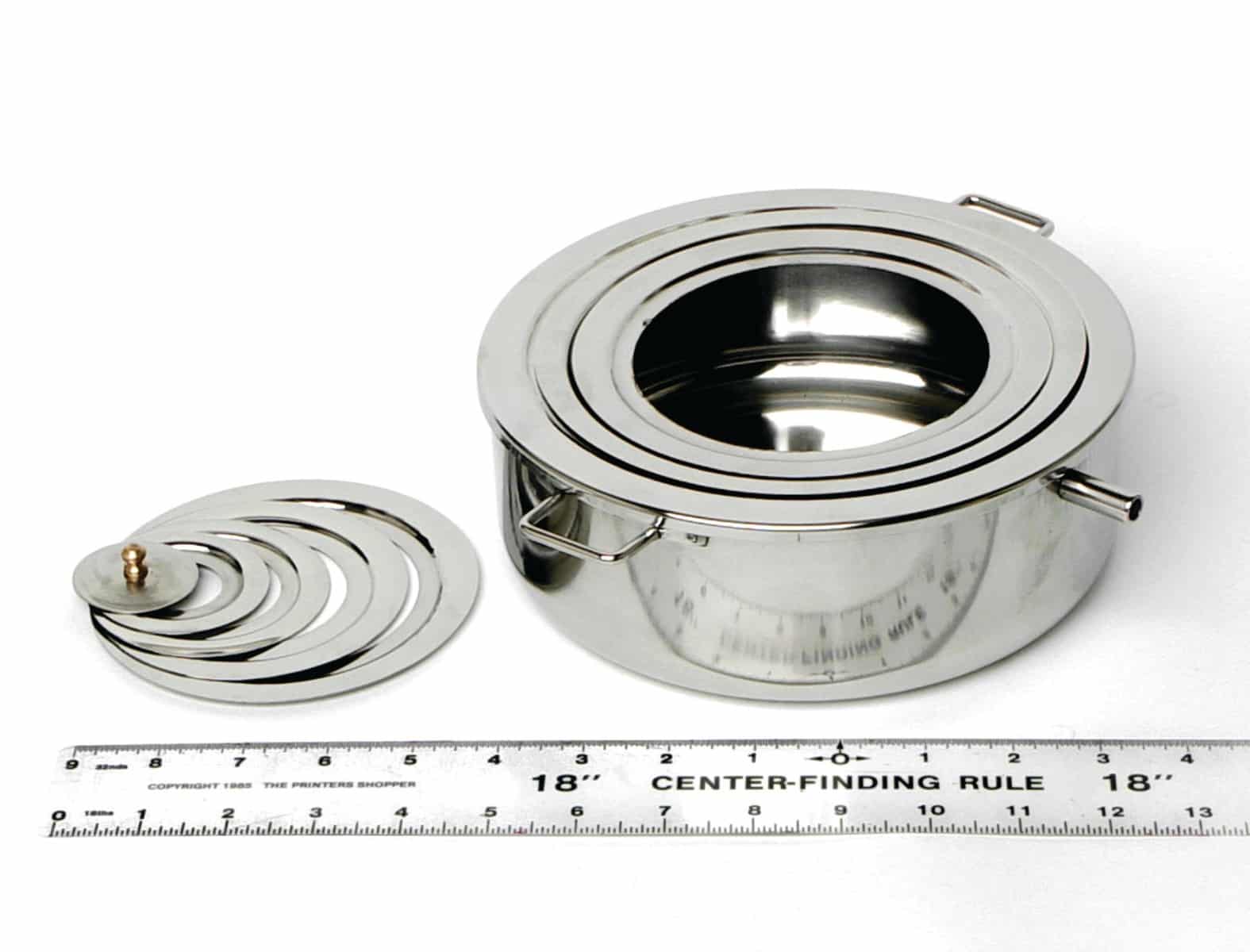 Solid stainless steel water bath measures 8″ in diameter x 2.75″ deep. Features seven concentric rings, steam escape outlet, flat bottom, and handles. Ideal for a variety of heating applications in the laboratory.