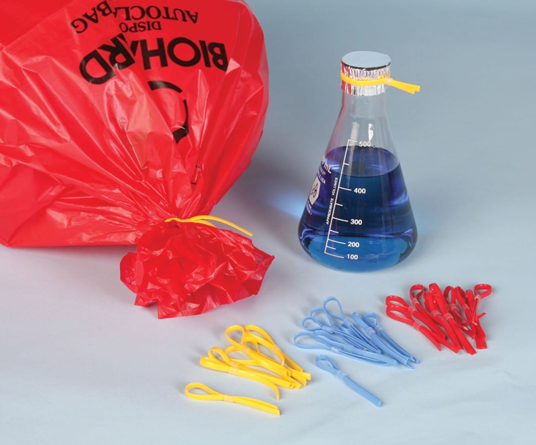 These flexible bands solve your bundling, binding and color coding problems in the laboratory. Use these adjustable “rubber bands” in the autoclave or freezer, or for securing columns and burettes to supports. The loops are also useful for controlling flexible tubing, keeping foil covers on canisters and securing dialysis bags or biohazard bags.