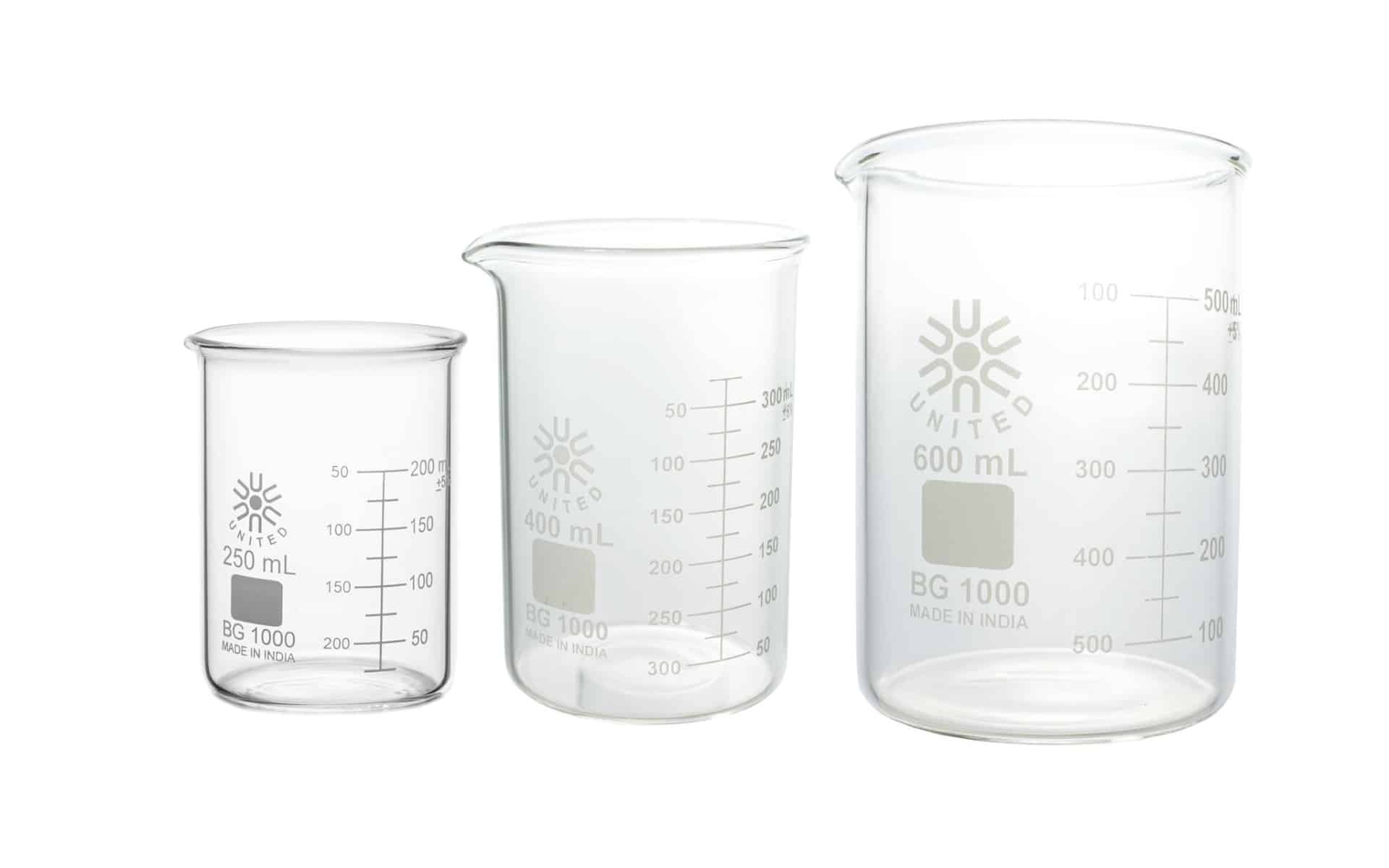Our beakers are made from low-expansion borosilicate glass. Beakers feature heavy and uniform wall thickness, spouts designed for easy pouring, and beaded tops. Beakers also have a double graduated metric scale and a marking area. Tolerance for beakers is approximately +/- 5%.
