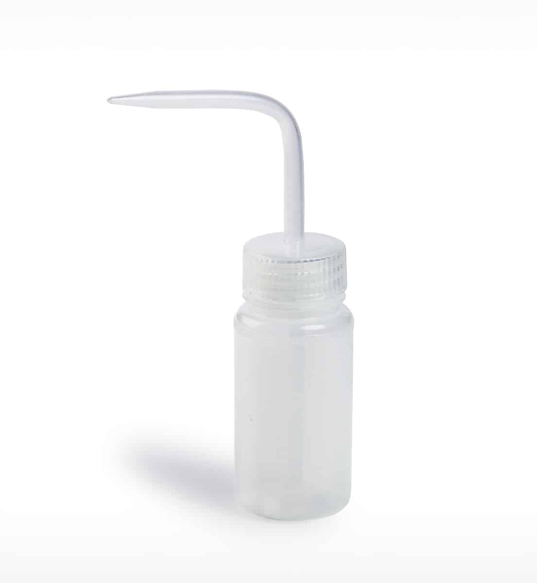Low-density polyethylene wash bottles have natural color polypropylene closures and wide mouths for easy filling.