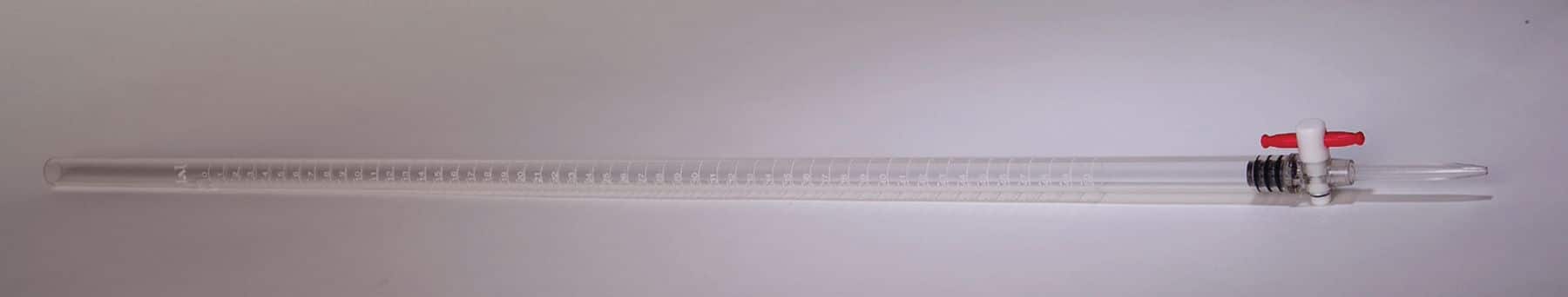 These burets have a clear acrylic body and leakproof stopcock with a self lubricating PTFE plug. Acrylic body is resistant to dilute mineral acids and bases except Hydrofluoric Acid and Ammonium Hydroxide. Graduations are in 0.1mL increments.