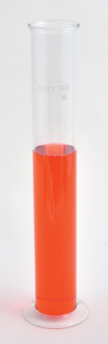 Made from heavy borosilicate glass, these cylinders have a beaded top with a pouring spout and a round base for stability.
