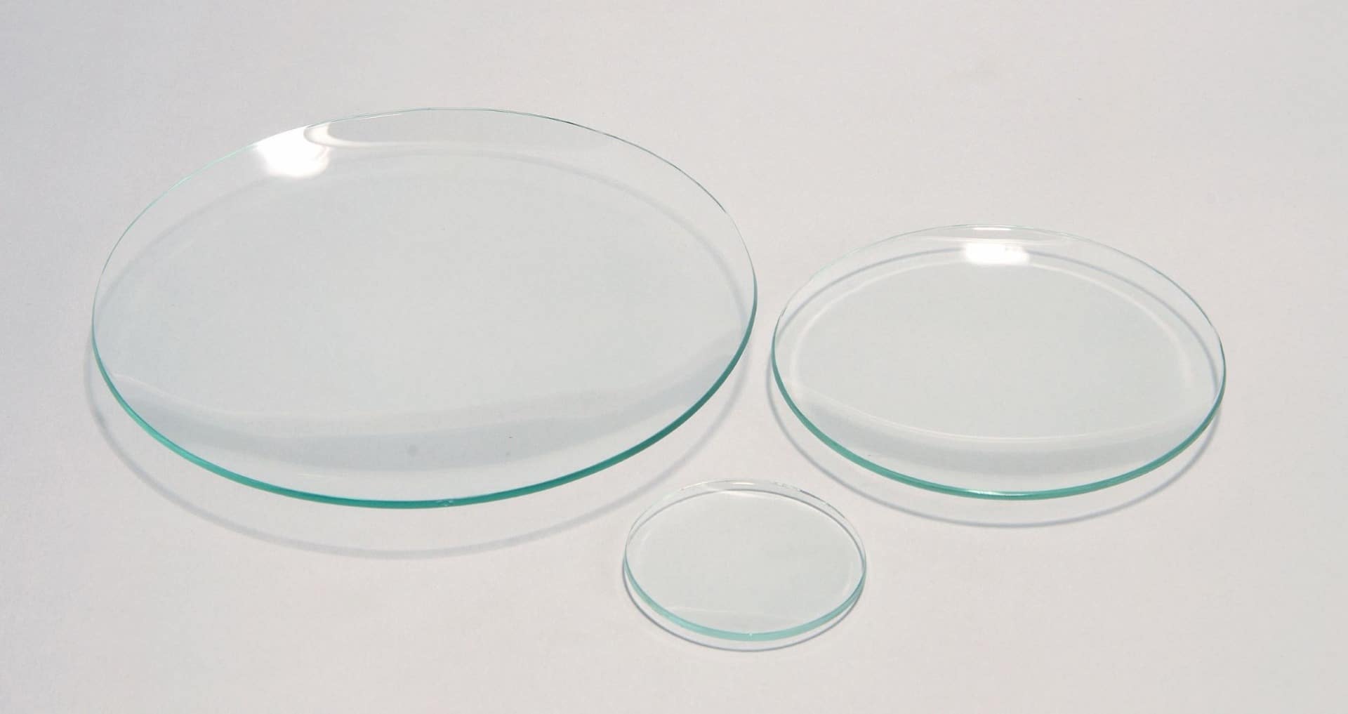 Economy watch glasses made from clear flint glass (1.8 to 2.0mm thick), fine ground and polished edges.