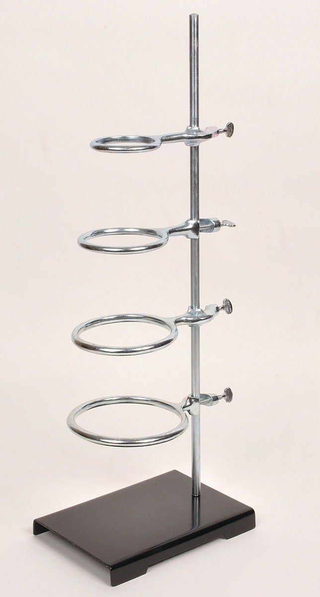 Each set contains a stamped steel base with black enamel finish and a removable zinc-plated steel rod, along with 2, 3, 4, or 5 cast iron rings with boss head clamps.