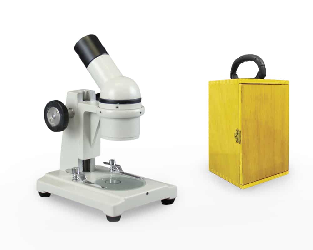 This beginner stereo microscope is excellent for studying insects, pond water, rocks, plants, and three-dimensional specimens. It contains a locked-on 10X wide-field eyepiece with a 2X objective which provides a total magnification of 20X. Great for use outside of the classroom as it has a wooden carrying case for transport. Suitable for grades K to 6. Comes with a limited 5 year warranty.