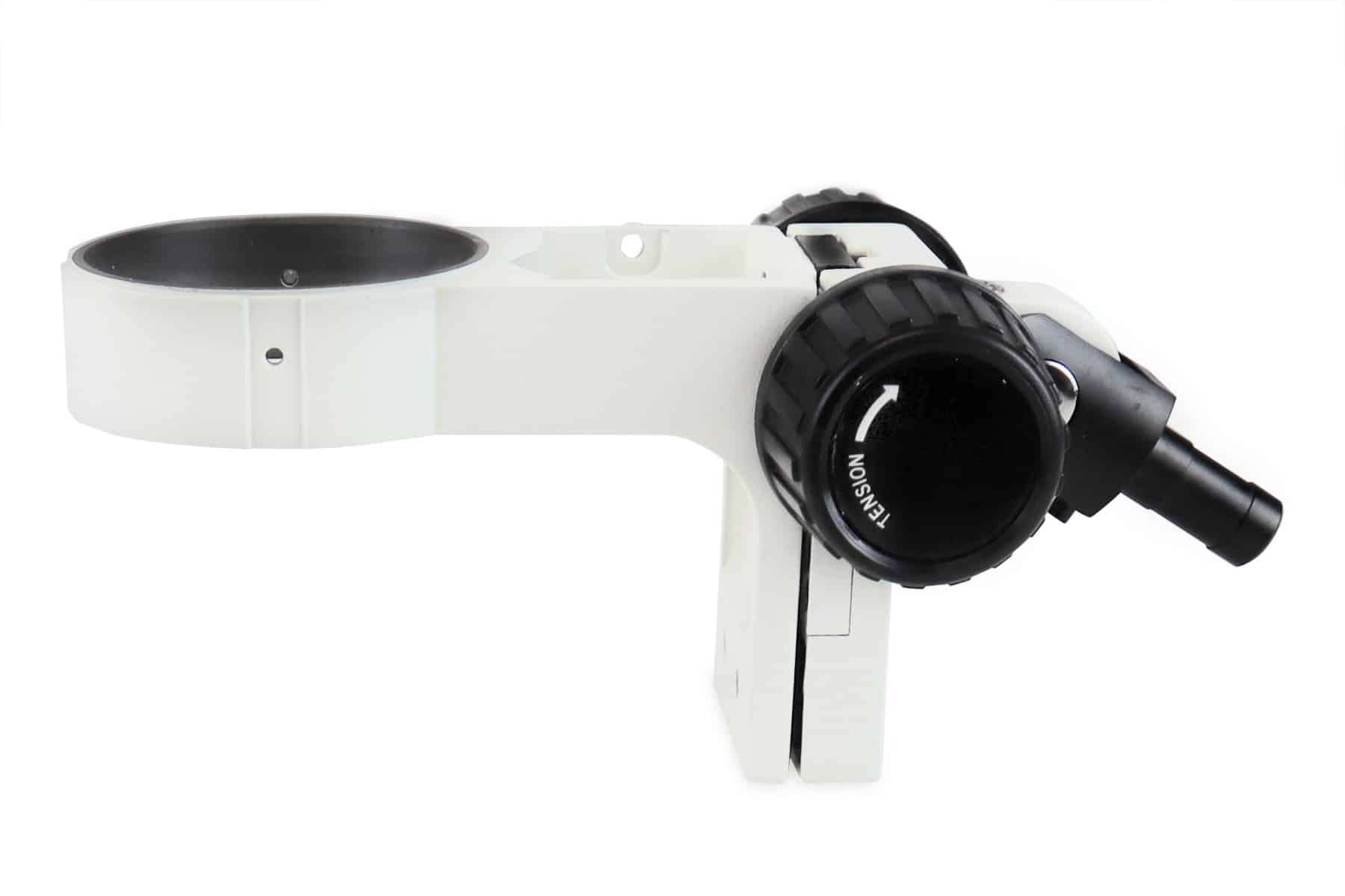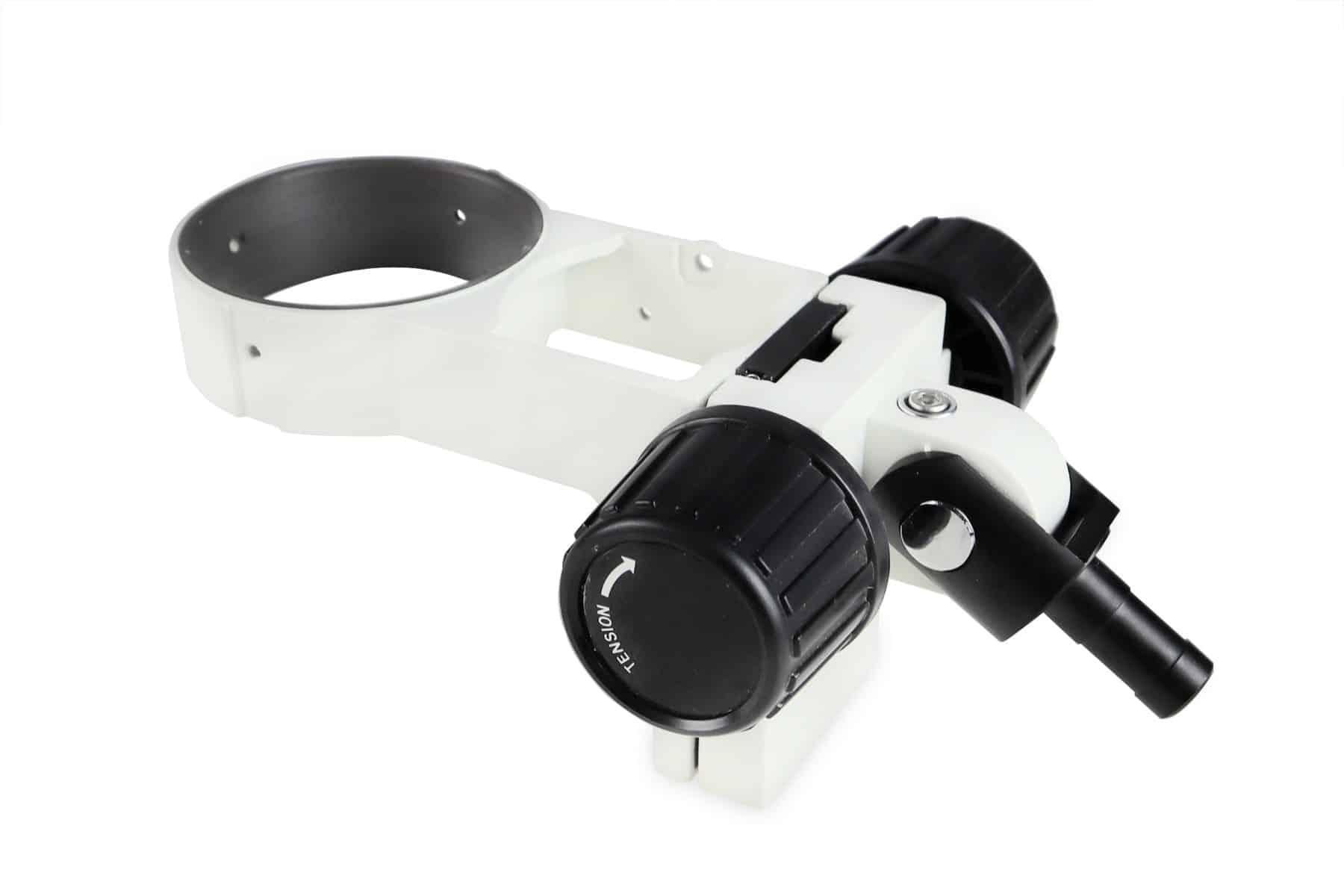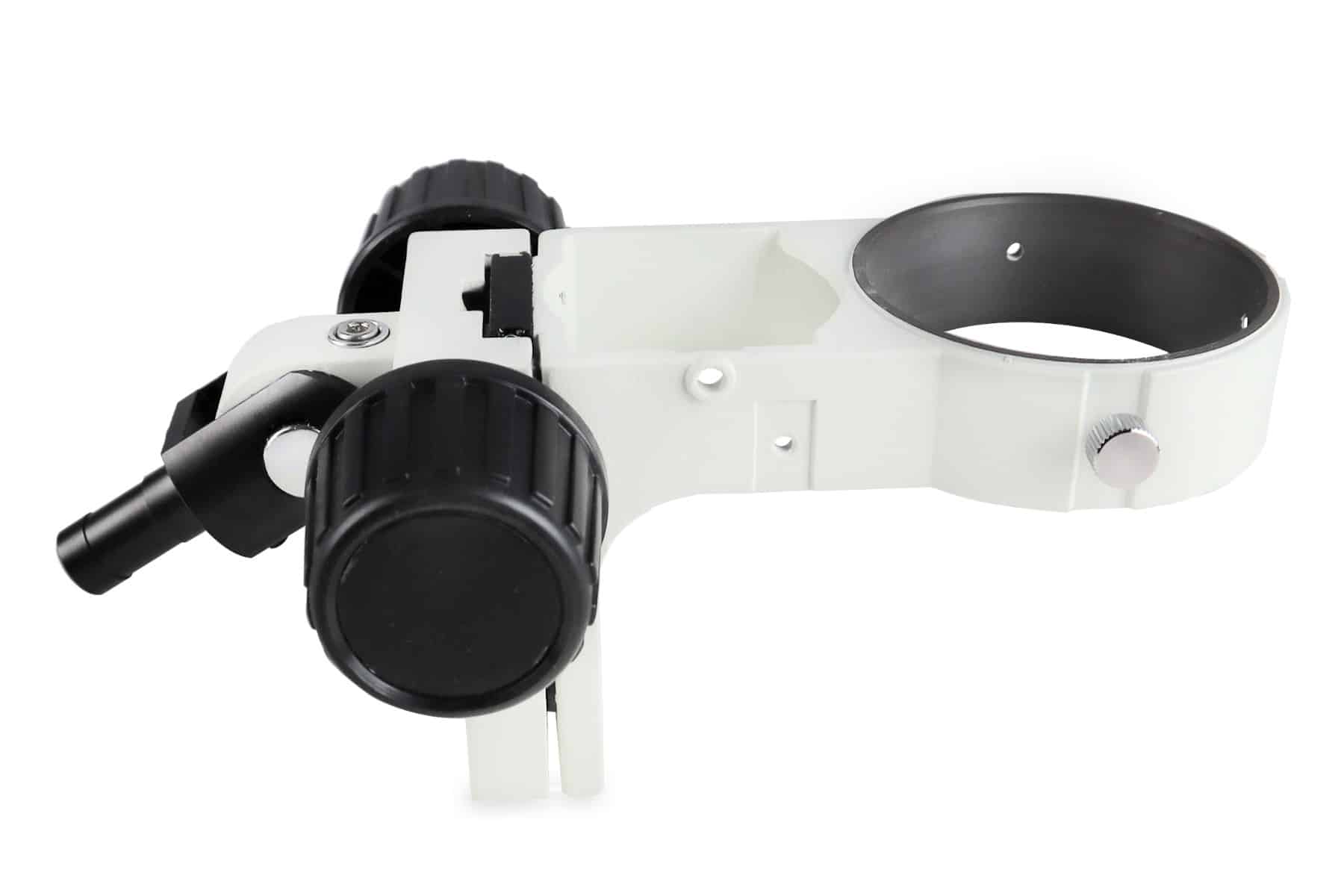 This is a heavy-duty pin-tail focus block for stereo microscopes. It comes with a ball bearing, 3″ (76mm) diameter annular ring that holds the microscope head. The focus gear has bilateral coarse focus knobs and tension adjustment.