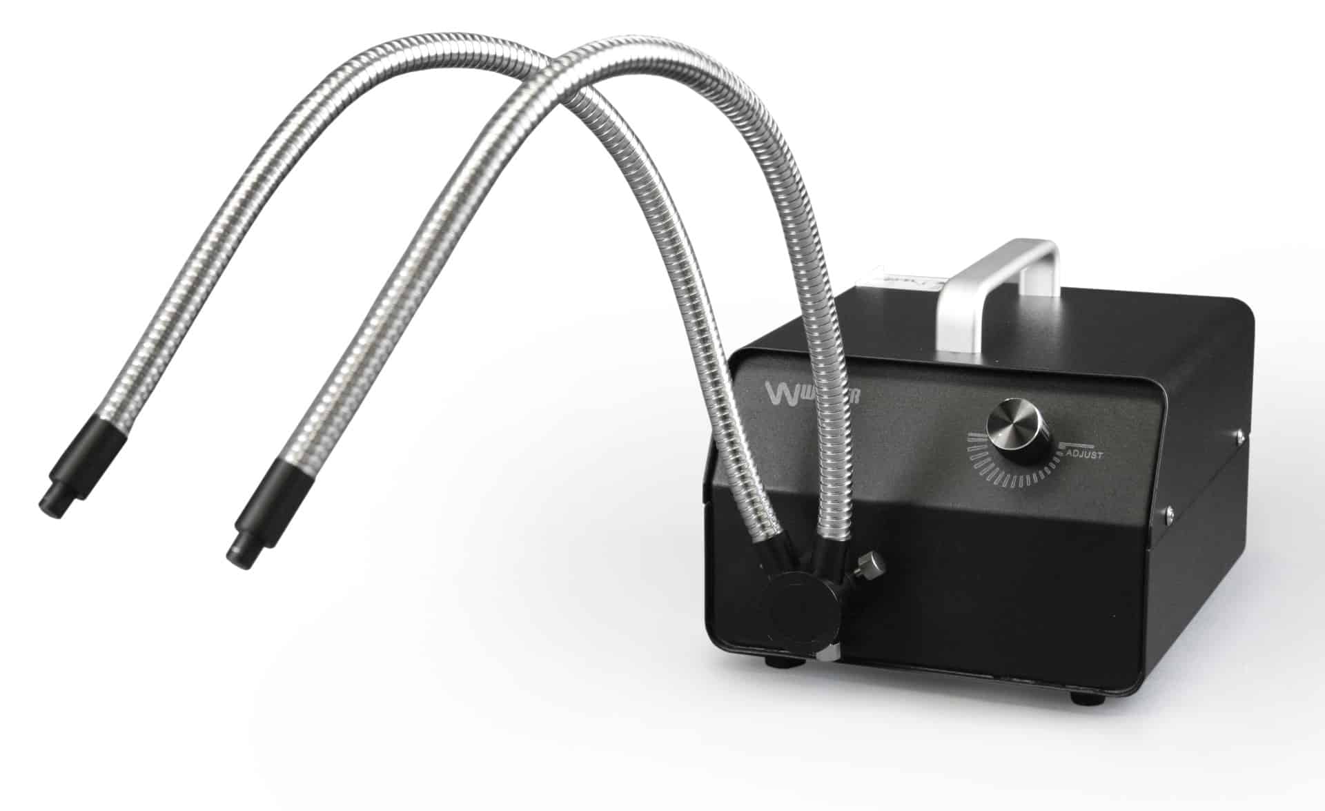 This high performance illuminator delivers high intensity illumination, using a 150W halogen lamp for enhanced image viewing. 0 to 100% intensity control provides full variation in brightness. Low noise, fan cooled, with rubber feet for minimal vibration. This unit comes with a dual light pipes featuring self-supporting, chrome plated sheathing for variable, accurate positioning. Each pipe measures 18″ long. Access to halogen bulb through door on bottom of illuminator.