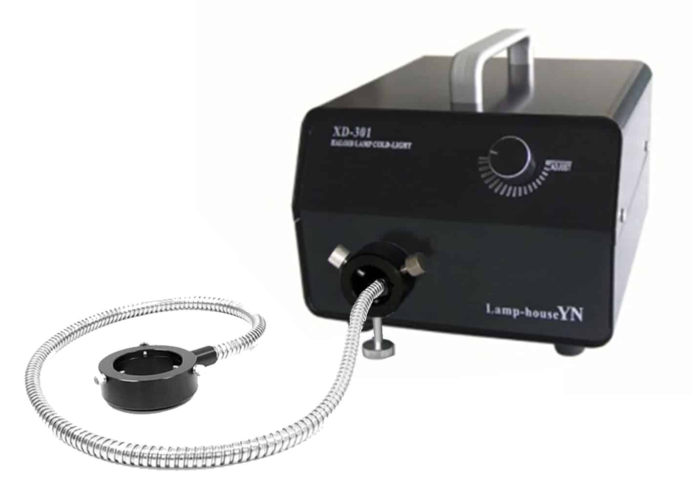 This fibre optic illuminator delivers high intensity halogen illumination that is glare and shadow free with continuous 360º even distribution of light. 0 to 100% intensity control provides full variation in brightness. Low noise, fan cooled, with rubber feet for minimal vibration. The ring mounts directly to a stereo microscope turret. Has non-supportive, chrome plated sheathing for positioning onto the microscope.
