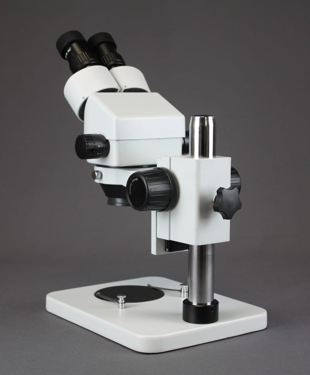 This binocular zoom stereo microscope is ideal for laboratory, industrial or medical applications. Using its high resolution, great depth, and a large field of view, it is the perfect instrument for viewing any three-dimensional or temperature-sensitive specimen or object. The compact, thin design of the base provides added comfort for the user and allows sample positions to remain low, which provides easy accessibility to variable light controls. The pillar stand provides a long working distance, to offer maximum flexibility when working with small or large samples. Rugged cast aluminum with gray enamel finish. Packed in a fitted Styrofoam box and includes a dust cover and an instruction manual. 5-year limited warranty.